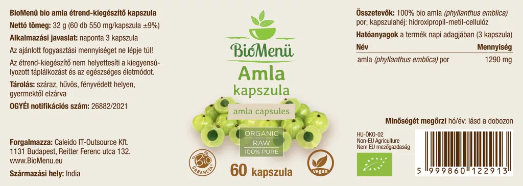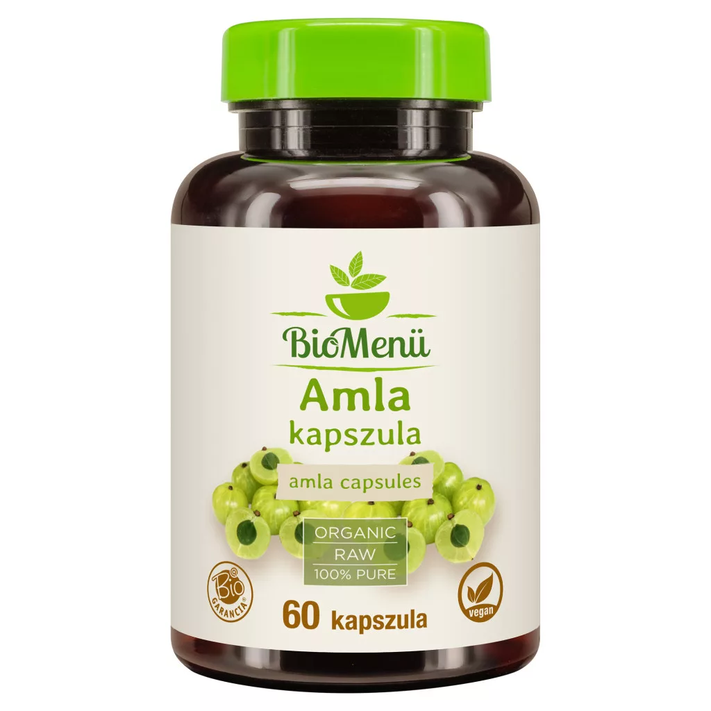 BioMenu BIO AMLA prah stavlja se u kapsule nakon blagog sušenja i mljevenja cijelog ploda na niskim temperaturama. 100% je prirodan, bez GMO-a i ne sadrži nikakve aditive. Iznimno je bogat izvor vitamina C. Sadrži velike količine polifenola, tanina, aminokiselina, antioksidansa i minerala.