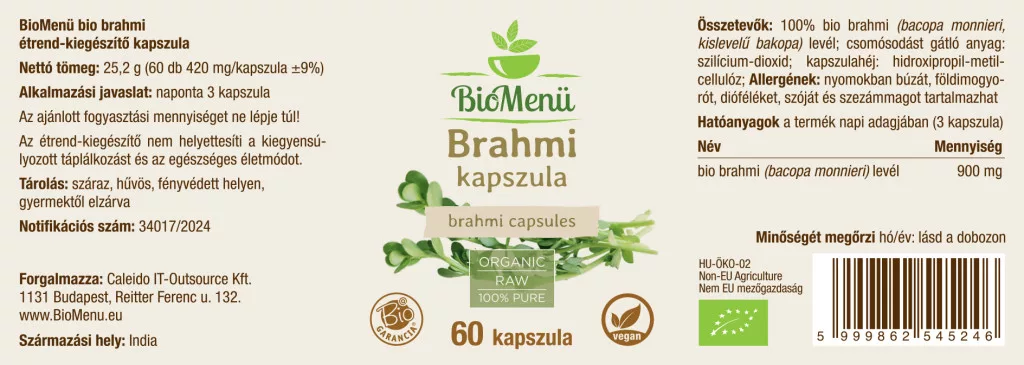100% organski list brahmija (bacopa monnieri, bakopa s malim listovima); sredstvo protiv zgrudnjavanja: silicijev dioksid; ovojnica kapsule: hidroksipropil metilceluloza; Alergeni: može sadržavati tragove pšenice, kikirikija, orašastih plodova, soje i sezama.