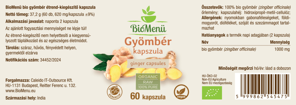 100% organski prah đumbira (zingiber officinale); ovojnica kapsule: hidroksipropil metilceluloza; Alergeni: može sadržavati tragove žitarica, kikirikija, orašastih plodova, soje i sezama