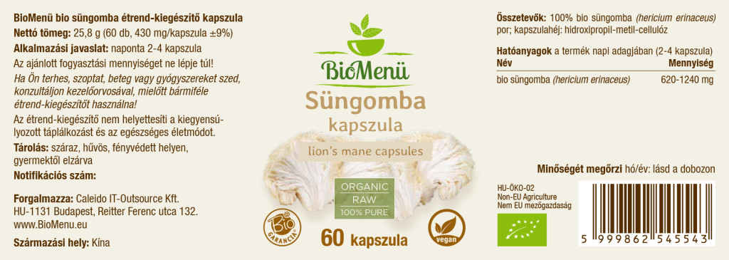 100% organski prah gljive jež (hericium erinaceus); ovojnica kapsule: hidroksipropil metilceluloza
