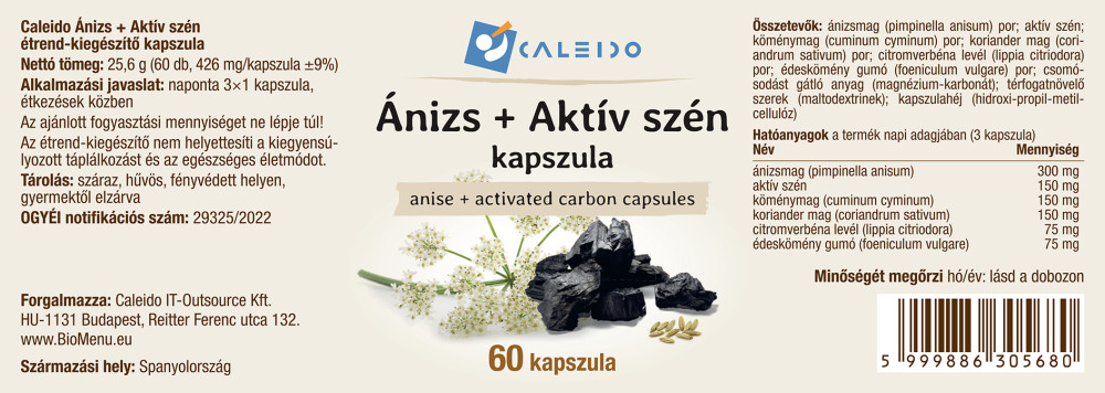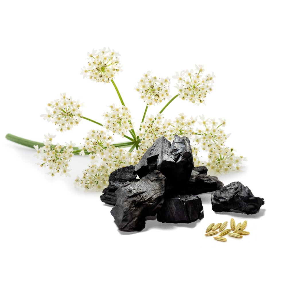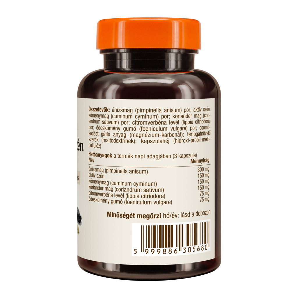 prah sjemenki anisa (pimpinella anisum); aktivni ugljen; prah sjemenki kima (cuminum cyminum); prah sjemenki korijandera (coriandrum sativum); prah lista limunske verbene (lippia citriodora); prah gomolja komorača (foeniculum vulgare); sredstvo protiv zgrudnjavanja (magnezijev karbonat); sredstva za povećanje volumena (maltodekstrini); ovojnica kapsule (hidroksipropil metilceluloza)